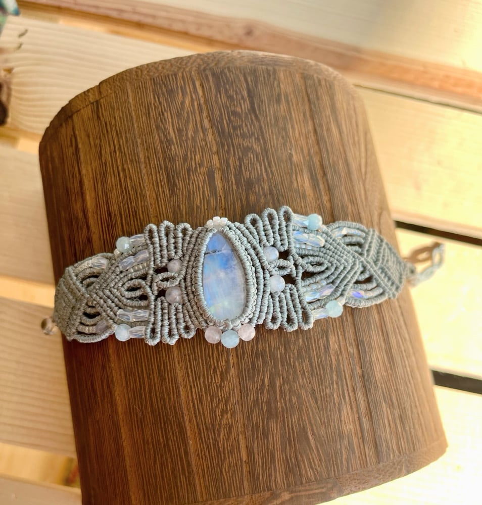 Macrame moonstone bracelet with aquamarine gemstone beads