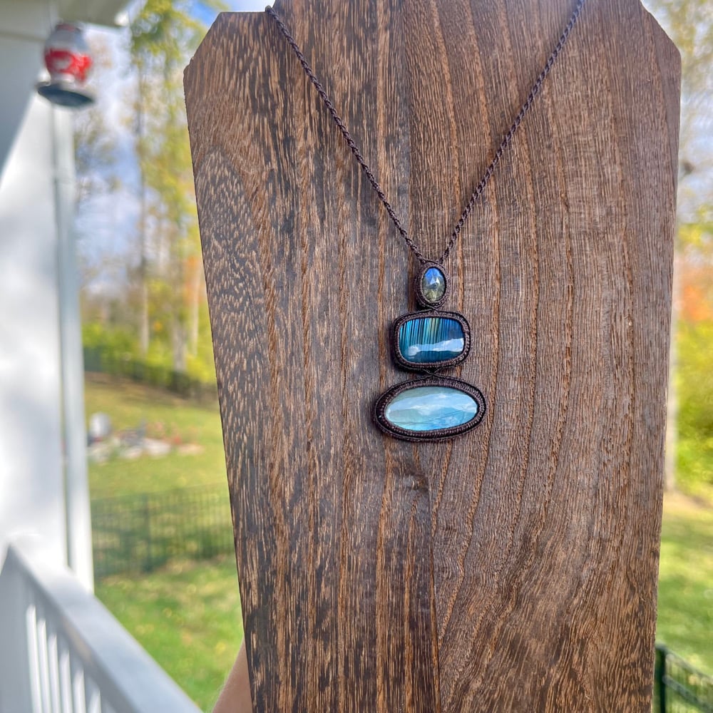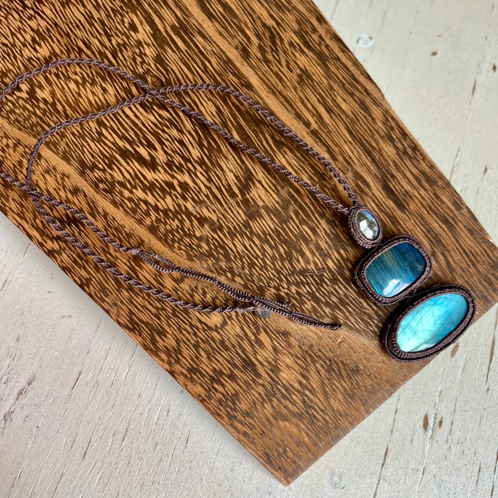 3 gorgeous cabochons exhibiting perfect labradorescence in this micro macrame necklace